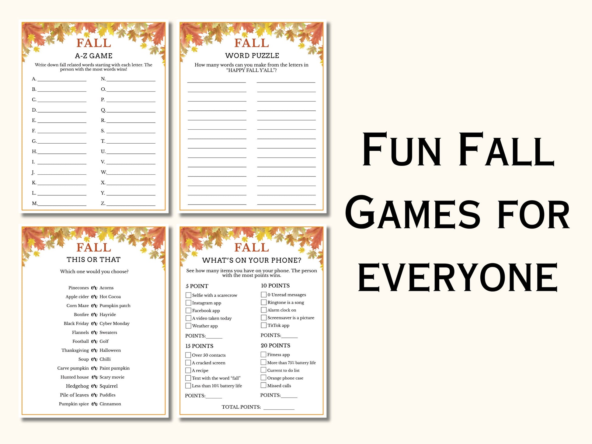 Fall Party Game Bundle - 12 Printable Games